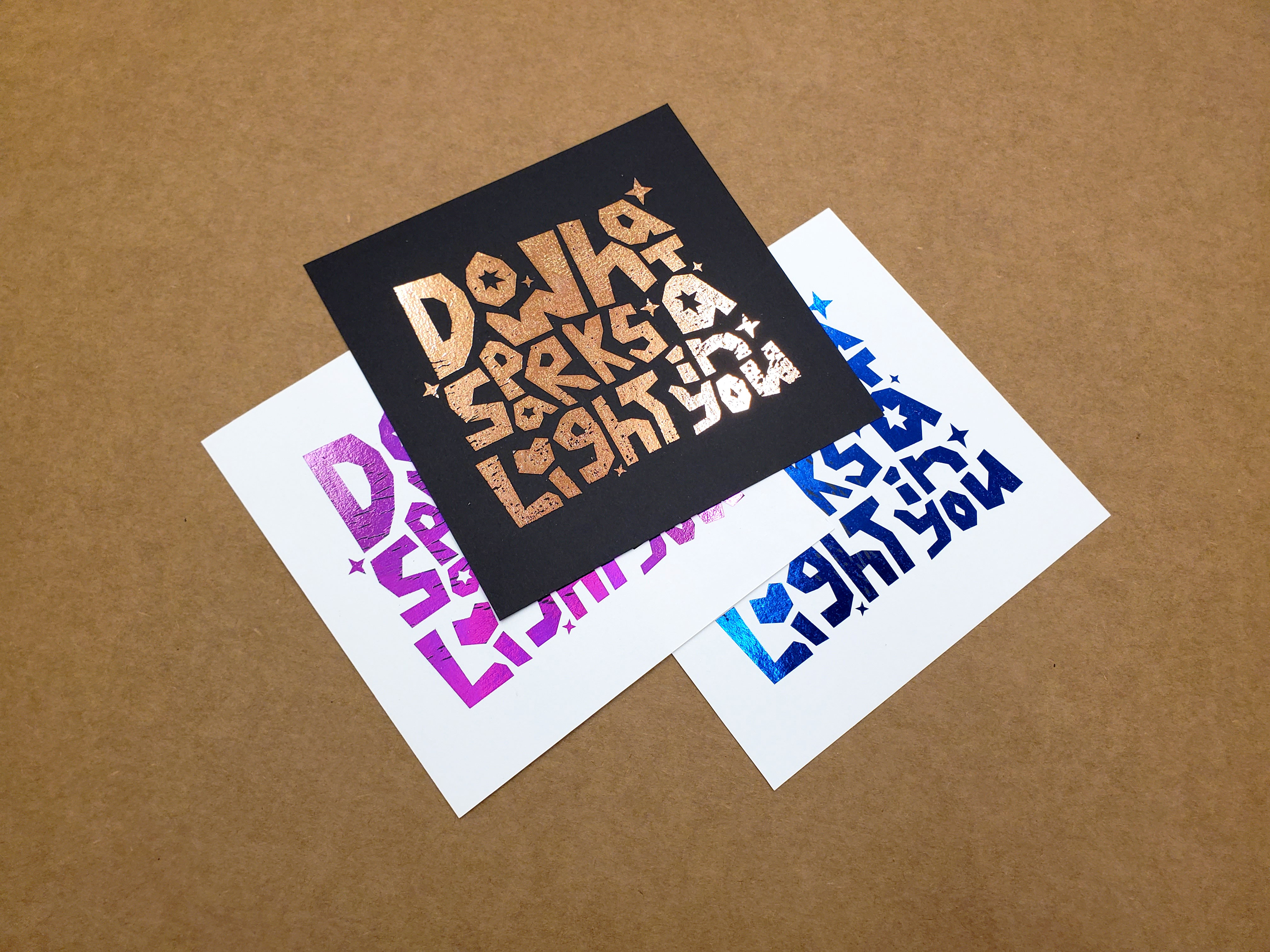 Digitally designed letterforms were lasercut to create the cards. The last image showcases the foil printed version of the same design in multiple colors.